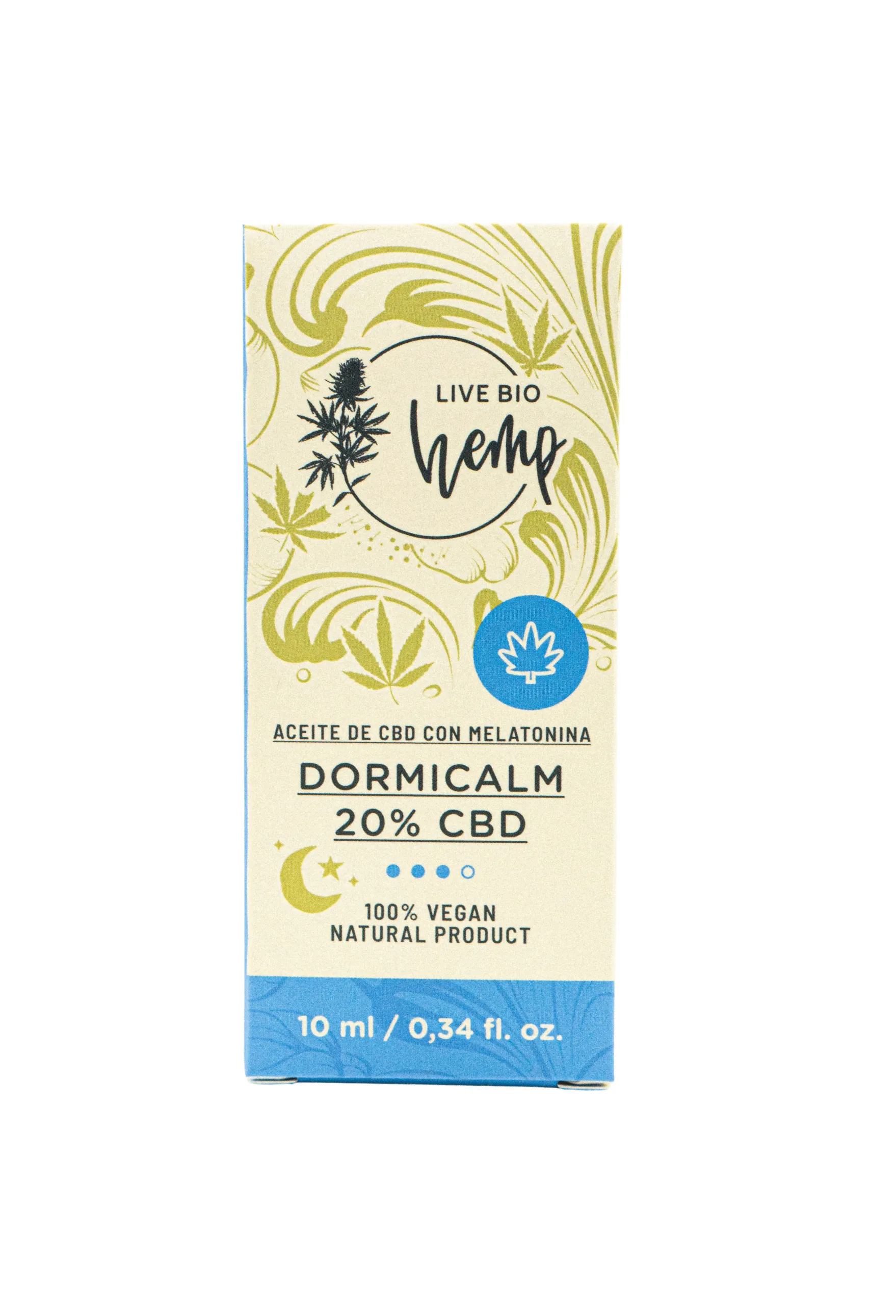 El aceite Dormicalm es un aceite Full Spectrum específicamente para las personas que sufren insomnio. Este aceite contiene cáñamo en su forma más pura y sin procesar. Asimismo, este extracto contiene todos los cannabinoides presentes en el cáñamo como el CBD, CBDA, CBN, CBC, CBGA, CBG, CBDVA y CBDV conteniendo el mayor porcentaje en CBD, CBN y CBG. Este aceite contiene una concentración del 10 % de CBD (Cannabidiol) + 5% de CBN + 5% CBG + 3% MELATONINA + 0.2% LINALOOL en 10 ml y está mezclado con aceite orgánico MCT (aceite de coco).